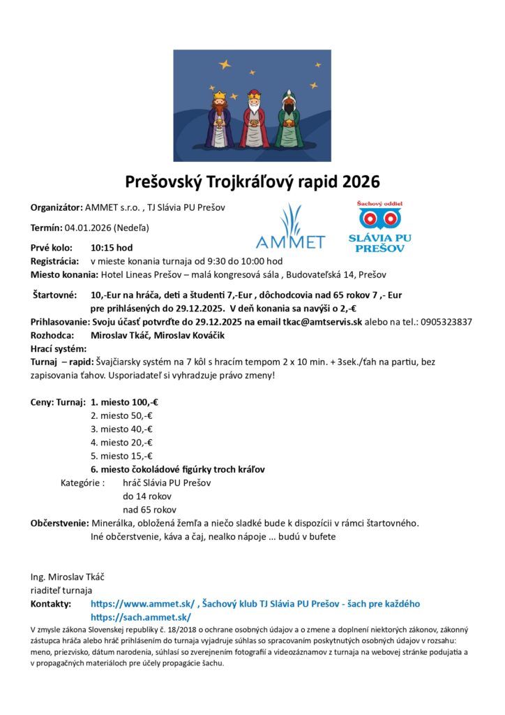 pozývame Vás na Trojkráľový šachový turnaj, ktorý sa uskutoční 4.1.2026 v priestoroch Hotela Lineas Prešov v malej kongresovej sále. Je to výborná príležitosť stretnúť sa v novom roku a zahrať si zaujímavé partie.